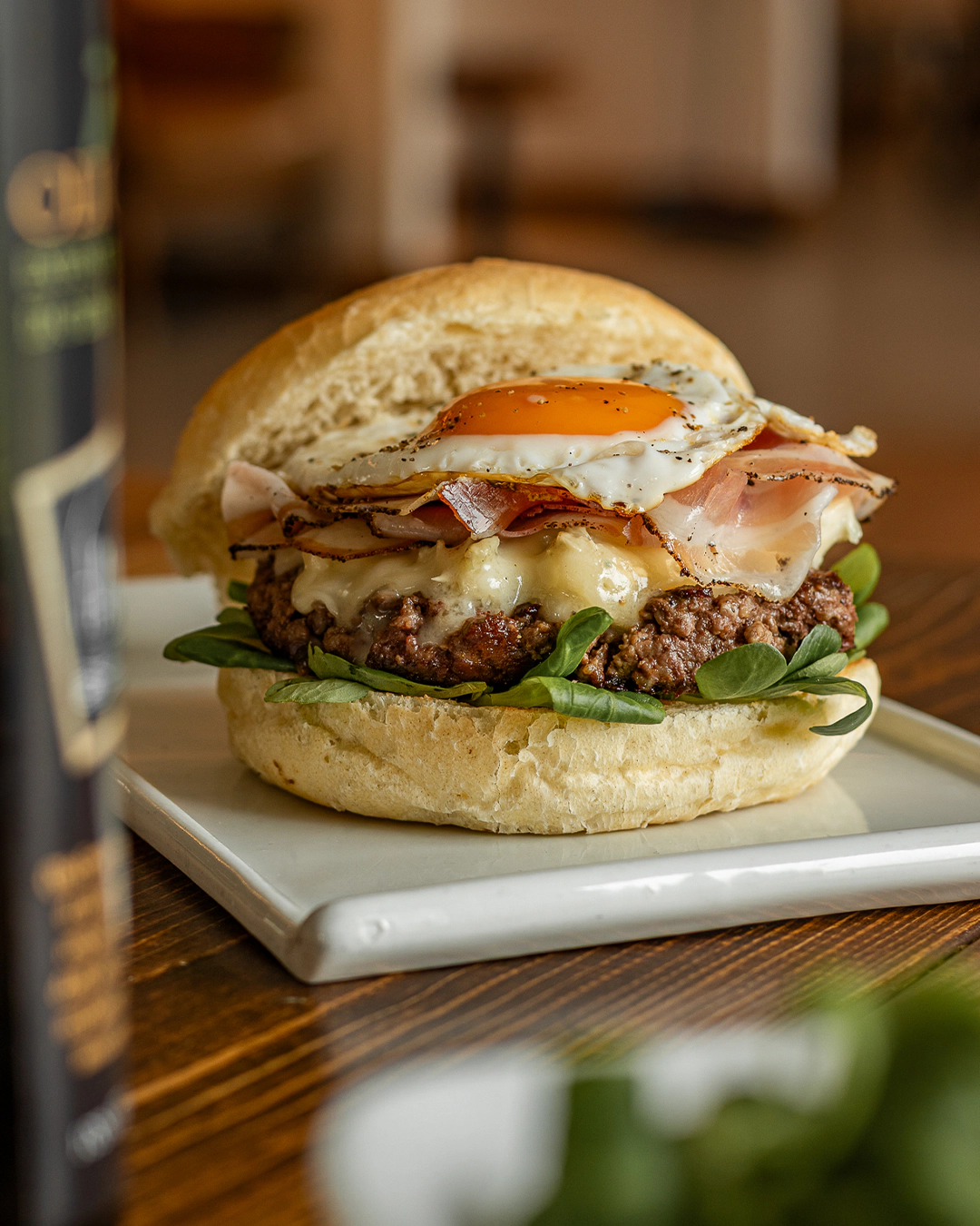 Pane al Semolino, Hamburger di Fassona piemontese Coalvi, insalata Songino, Pancetta al pepe fresca, Uovo in cereghino e Gorgonzola fuso.